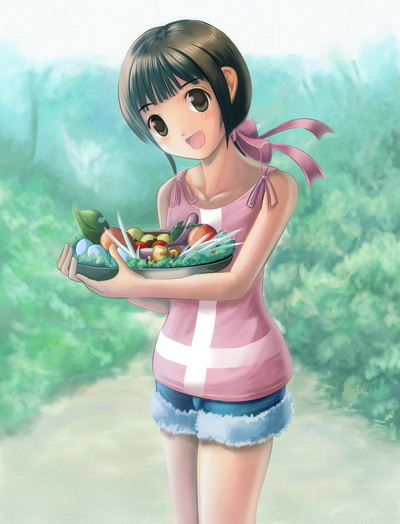 朝方にメロウの森で野菜などを摘み取ってきたり、な絵です。